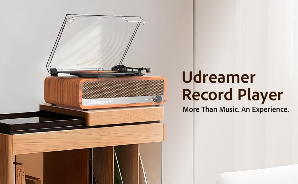 Udreamer all-in-one turntable player UD-002 combines retro charm belt-drive motor and modern Bluetooth technology. It supports 3 speeds of 33-1/3, 45 and 75 RPM, accommodating a wide range of vinyl records (7”, 10” & 12” vinyl record) for optimal playback. Featuring professional moving-magnetic cartridge, it delivers exceptional audio quality, ensuring every detail of your favorite tracks is reproduced faithfully. The vinyl record player UD-002 requires no external amplifiers or messy wires, simply unbox, plug in and play.
