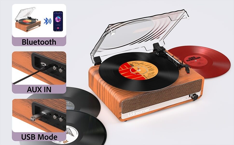 Our Udreamer turntable factory R&D team made the connectivity of the player conveniently, for UD-002 offering L&R RCA outputs and phono-line out for versatile connectivity options. Rear 3.5mm AUX input allows you to connect other audio devices effortlessly. With intuitive controls for volume, power ON/OFF, mode selection, and RPM adjustments via front knob and two switches. The front 3.5mm headphone jack lets users listen privately, enhancing their enjoyment of cherished albums in any setting. With advanced Bluetooth 5.3 technology, it allows seamless wireless connectivity to a variety of devices, enabling users to enjoy both digital audio and classic vinyl records without the need for external equipment.