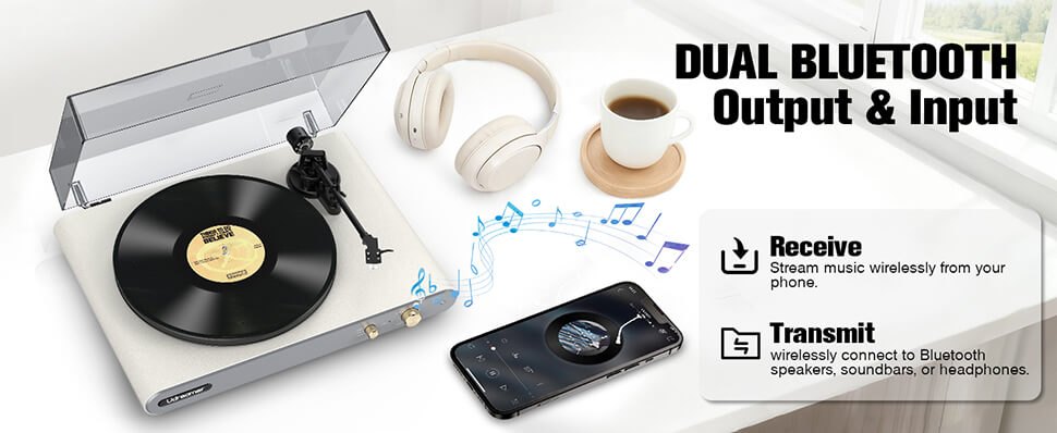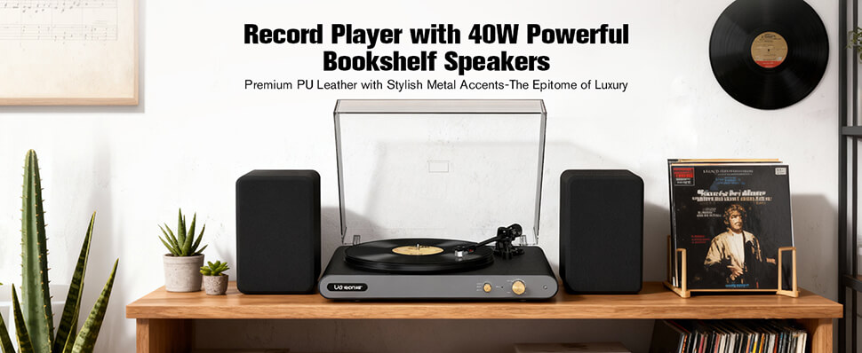 - Ultra-flat metallic and stylish leather design high performance belt-driven turntable and speaker set in black and white color option;